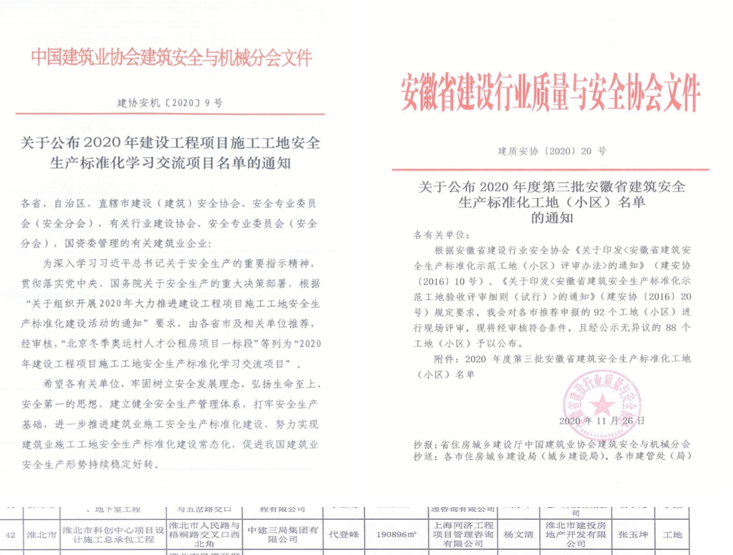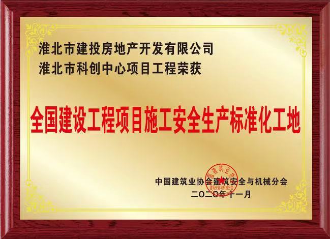 近日, 2020年中國建筑業(yè)安全生產(chǎn)管理經(jīng)驗交流會在北京舉行。會上公布了2020年 “全國建設(shè)工程項目安全生產(chǎn)標(biāo)準(zhǔn)化工地”(全國AAA級安全文明標(biāo)準(zhǔn)化工地)名單。 集團(tuán)公司工程部淮北市科創(chuàng)中心項目工程榮獲 “全國建設(shè)工程項目安全生產(chǎn)標(biāo)準(zhǔn)化工地”榮譽(yù)。