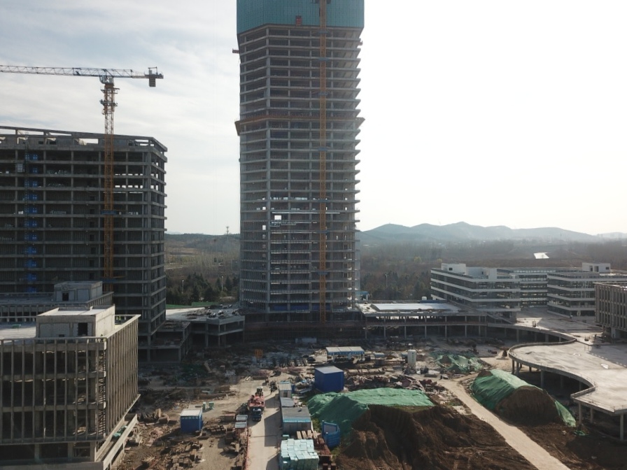 淮北第一高樓——商務政務中心采用框架核心筒結構,建筑面積超7萬平方米,設計復雜、施工難度大,地下室出正負零后以平均7天一層的速度向上生長,工程部副部長張玉坤駐點管理,項目在做到質量、安全雙優(yōu)的同時,以不到一年的時間實現(xiàn)封頂,刷新淮北速度。項目不僅提前完成了年度節(jié)點目標,而且先后獲得2020年“安徽省建筑安全生產標準化工地”、“全國AAA安全文明標準化工地項目”的省級、國家級榮譽,在全市范圍內先后召開了兩次市住建局主辦的建筑質量安全現(xiàn)場觀摩會,下一步將爭創(chuàng)“黃山杯”及“國優(yōu)”工程,做到進度、質量兩不誤。目前南區(qū)各主樓結構已全部封頂,二次結構、安裝工程完成70%,即將進入幕墻和裝飾裝修穿插施工階段。