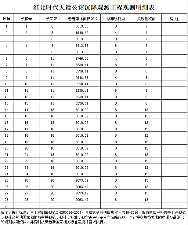 3、工程委托日期:自委托日起至整個施工過程沉降及竣工驗收后一年內(如滿足沉降規范范圍合格可停止觀測如不滿足規范需自行增加觀測直至沉降滿足規范標準后停止,費用包含在總價內)為沉降觀測期。