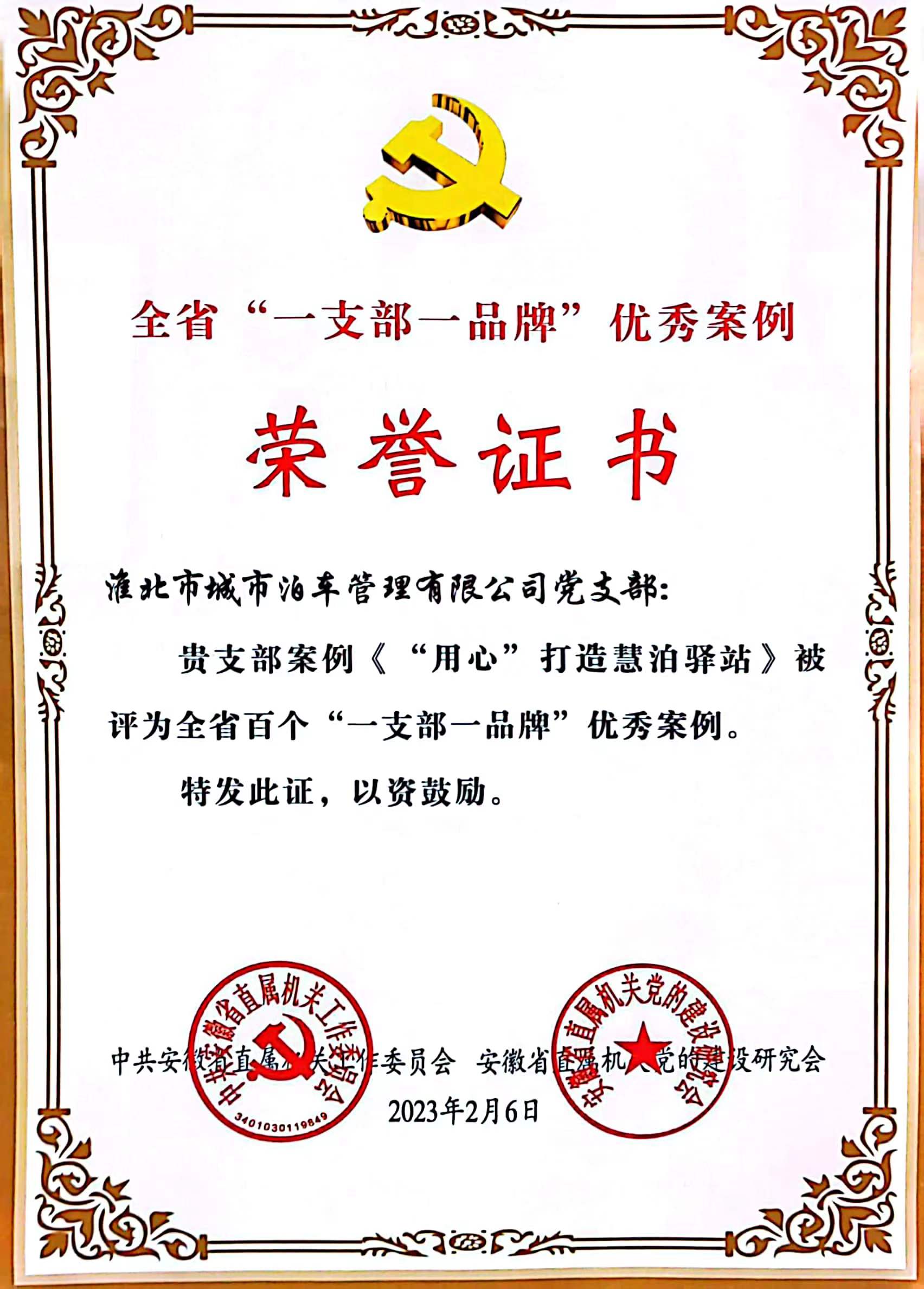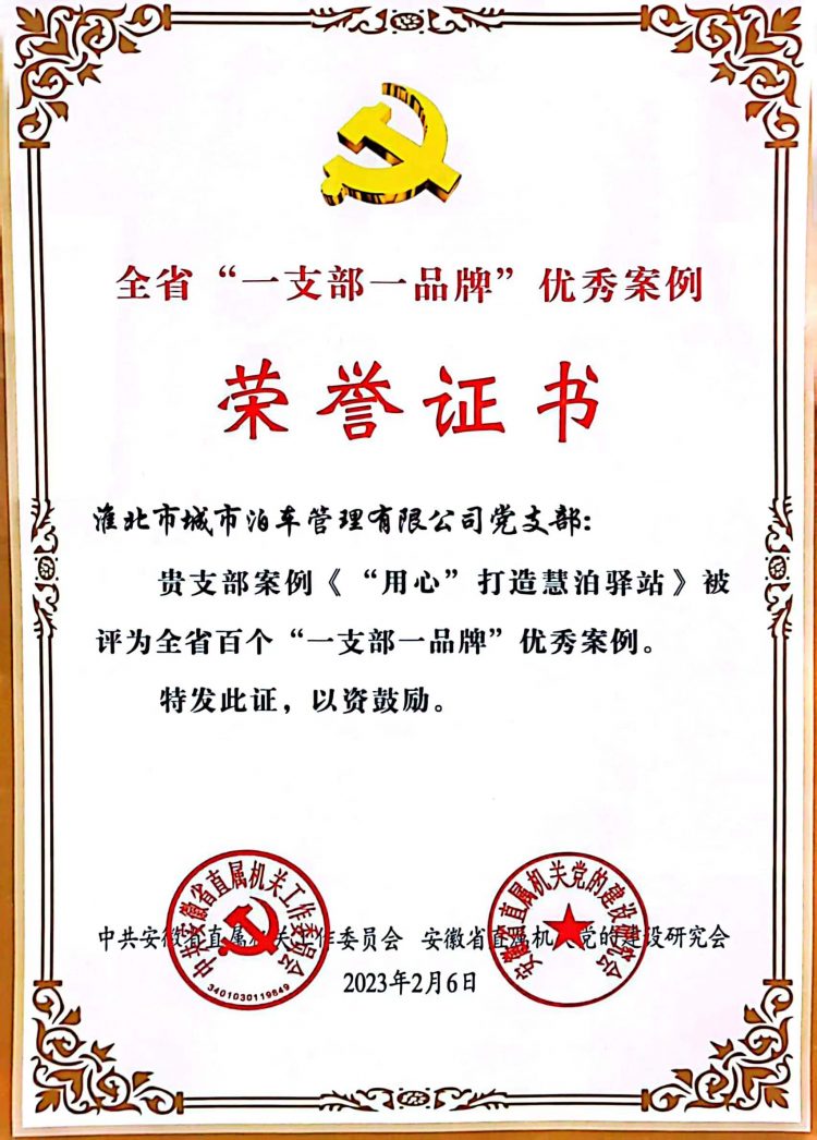 日前,中共安徽省直屬機關(guān)工作委員會、安徽省直屬機關(guān)黨的建設研究會聯(lián)合發(fā)文表彰了全省百個“一支部一品牌”黨建工作典型案例,此次“一支部一品牌”黨建工作典型案例評選全省共有400家單位586個優(yōu)秀案例參加初評和復審,最終綜合評定100個“一支部一品牌”優(yōu)秀案例。淮北城市泊車管理有限公司黨支部獲得通報表彰,支部的黨建品牌《“用心”打造慧泊驛站》獲評全省百個“一支部一品牌”優(yōu)秀案例。