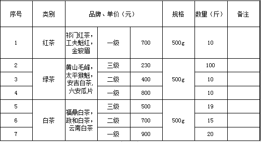 本項目是淮北市建投控股集團有限公司2021年度茶葉采購項目,具體如下:![]() 注;1、二級三級茶葉采用盒裝或罐裝包裝,一級采用禮品裝包裝(以采購方實際需求為準)。 2、重量為除去包裝后茶葉凈重要求。 3、本次茶葉采購具體數量可能略有變化,按照實際采購數量確定。 |