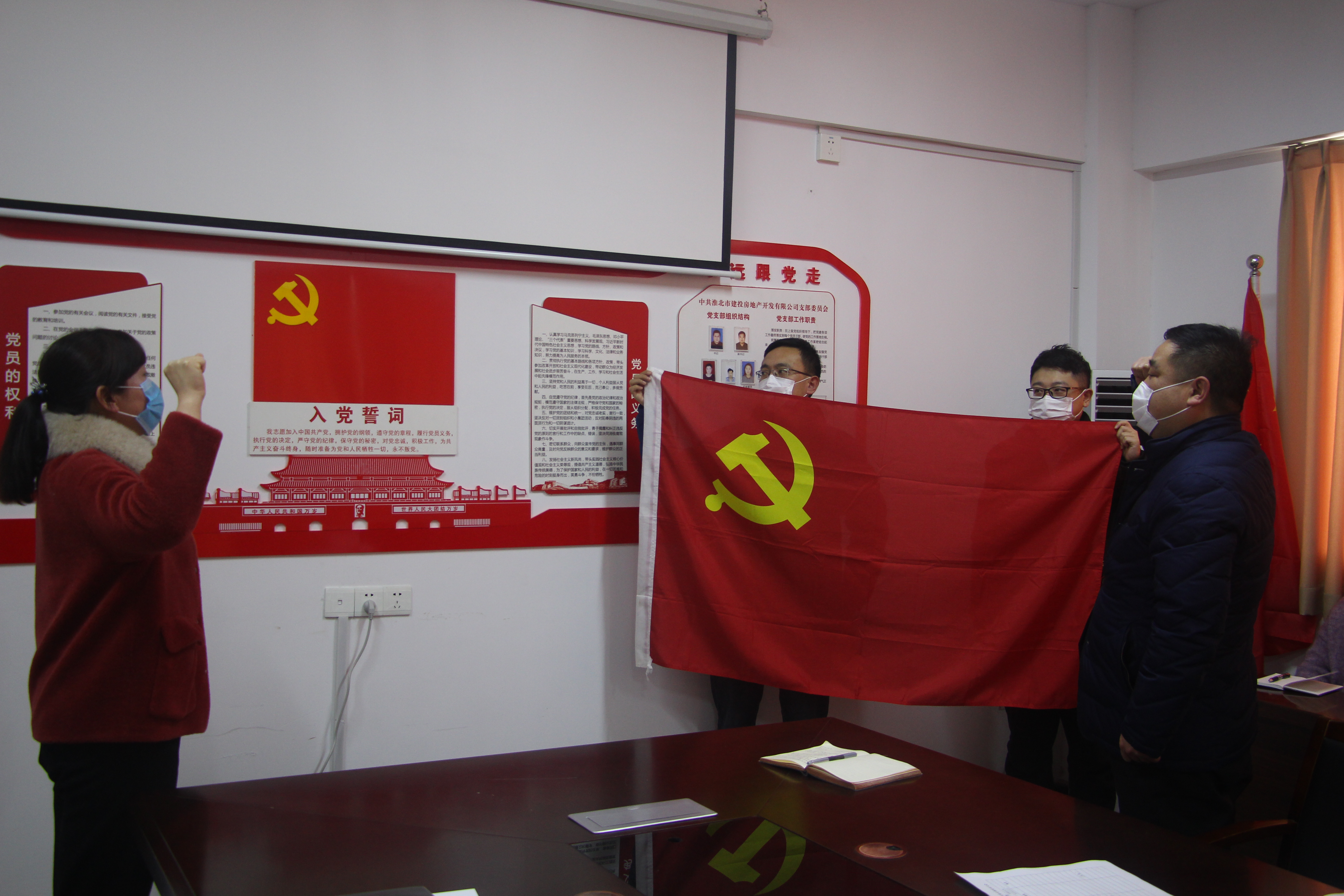 3月2號下午,在淮北市建投房地產公司會議室召開了一次特殊的黨員大會。這次會議的主題就是是否吸納趙倩倩為預備黨員。在趙倩倩作了申請發言后,房地產黨支部參加會議的黨員全票通過了趙倩倩同志轉為預備黨員,隨后支部副書記童曉強帶領她面對鮮紅黨旗莊嚴宣誓。