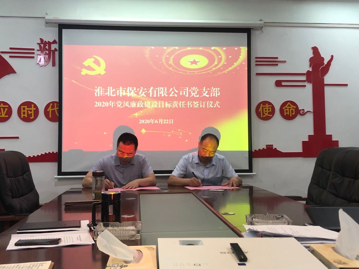 會后,保安公司黨支部舉行了2020年黨風廉政建設目標責任書簽訂儀式,支部書記與公司經營班子,經營班子與中層管理人員簽訂了黨風廉政建設目標責任書,在黨風廉政建設與廉潔自律方面做出的約束,通過責任書的簽訂,形成了以上率下、層層壓實責任的黨風廉政建設責任體系,進一步武裝員工思想,筑牢了拒絕腐敗的思想道德防線,增強了全體黨員干部的廉潔自律意識,確保黨風廉政建設責任落實到位,為保安公司的高質量發展提供了保障。