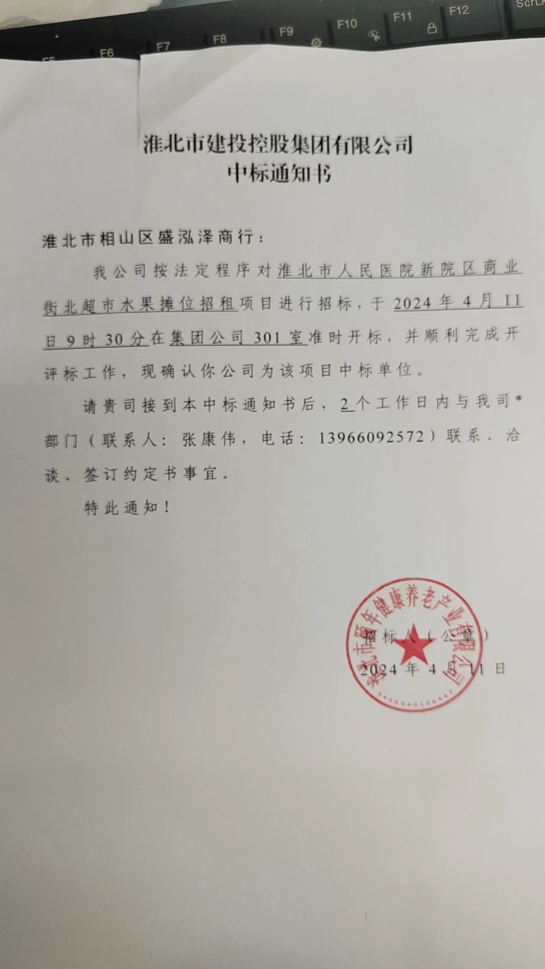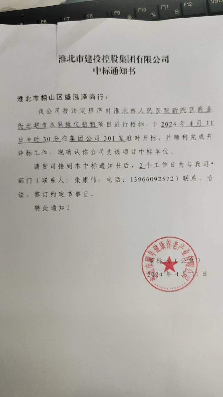我公司按法定程序?qū)?/span>淮北市人民醫(yī)院新院區(qū)商業(yè)街北超市水果攤位招租項(xiàng)目進(jìn)行招標(biāo),于2024年4月11日9時(shí)30分在集團(tuán)公司301室準(zhǔn)時(shí)開標(biāo),并順利完成開評(píng)標(biāo)工作,現(xiàn)確認(rèn)你公司為該項(xiàng)目中標(biāo)單位。