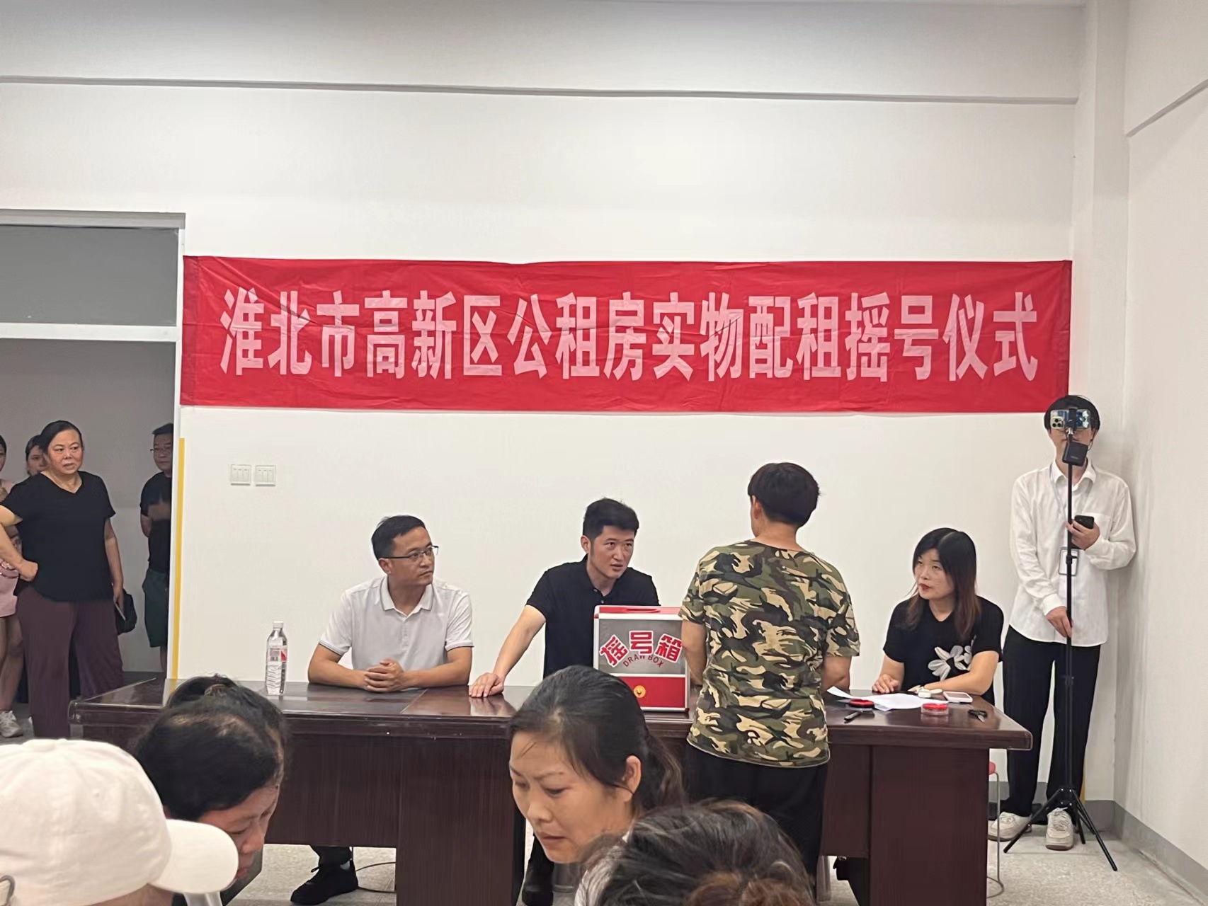 2024年7月17日,淮北市高新區公租房實物配租公開搖號儀式在龍湖新村小區舉行,通過本次公租房實物配租,37戶園區住房困難職工家庭圓住房夢。市高新區國土規劃局、保障房公司及建投物業相關負責人參加活動。