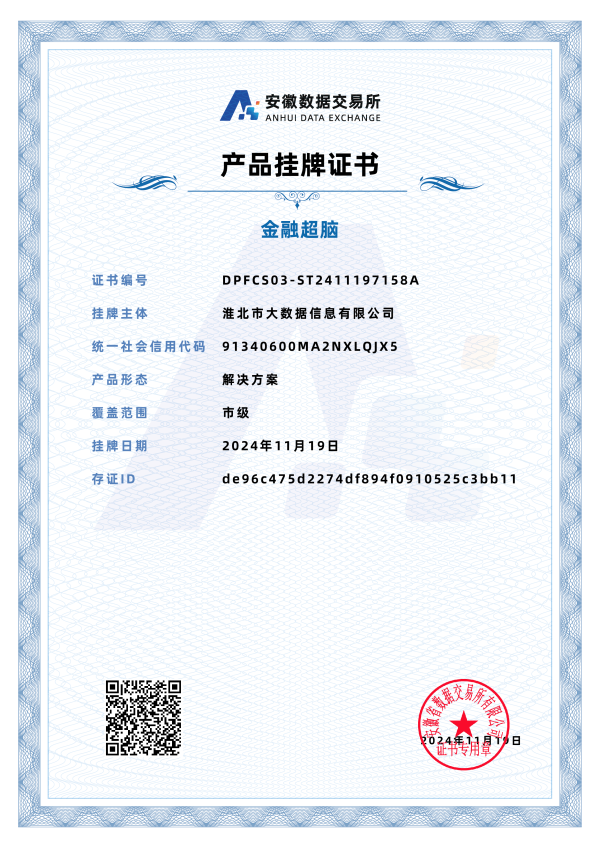 數(shù)據(jù)產(chǎn)品掛牌上市正式開(kāi)啟數(shù)據(jù)交易之旅,持續(xù)擴(kuò)大“金融超腦”產(chǎn)品的影響力,促進(jìn)我市普惠金融業(yè)務(wù)均衡發(fā)展,推動(dòng)大眾創(chuàng)業(yè)、萬(wàn)眾創(chuàng)新,助推經(jīng)濟(jì)發(fā)展方式轉(zhuǎn)型升級(jí)。同時(shí),憑借在金融超腦平臺(tái)上的普惠金融助貸數(shù)據(jù)集,淮北市大數(shù)據(jù)信息有限公司順利申請(qǐng)到數(shù)據(jù)知識(shí)產(chǎn)權(quán),進(jìn)一步彰顯了公司在數(shù)據(jù)資源開(kāi)發(fā)利用與合規(guī)管理方面的卓越能力與前瞻性布局。