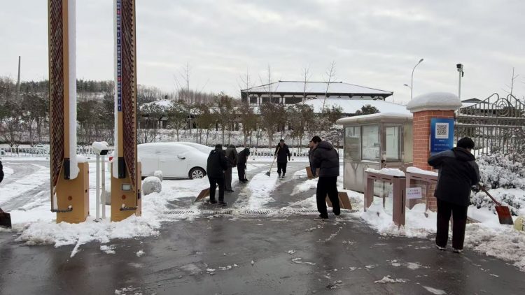 保安公司對(duì)辦公樓前、主干道等區(qū)域的積雪進(jìn)行人工清理,重點(diǎn)鏟除路面結(jié)冰區(qū)域,確保人員與車(chē)輛通行安全。