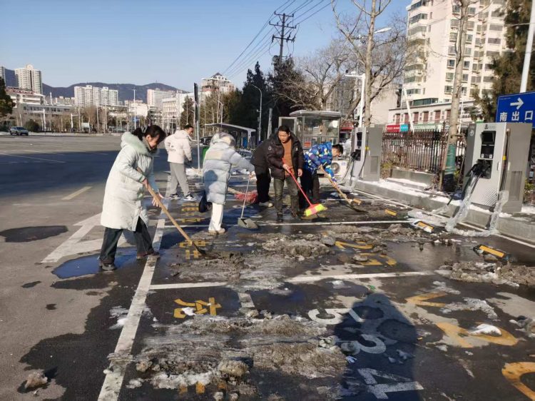 活動(dòng)現(xiàn)場(chǎng),黨員們攜帶鐵鍬、掃帚等工具,分工協(xié)作。大家不顧嚴(yán)寒,彎腰揮鏟、奮力清掃,重點(diǎn)清理充電站出入口、充電車位及周邊通道的積雪與薄冰。數(shù)小時(shí)奮戰(zhàn)后,充電站內(nèi)外積雪全部清理完畢,為市民營(yíng)造了安全、暢通、便捷的充電環(huán)境。
