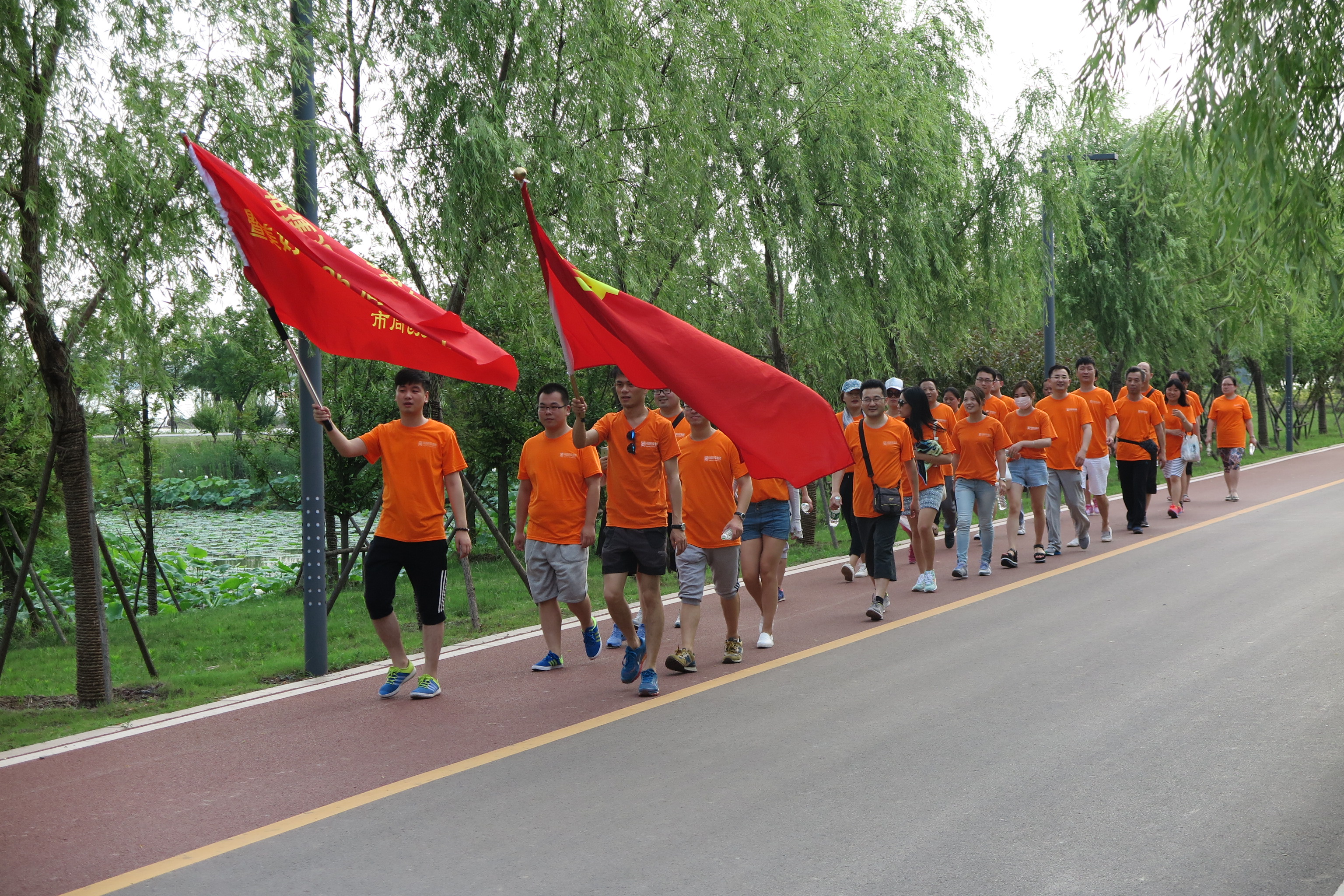 健步活動在美麗的南湖公園舉行,橘紅的身影、飄揚的旗幟與蔚藍的南湖融為一體。途中,大家邁著矯健的步伐,高舉黨旗,充分發揚友愛互助的團隊精神,圓滿的完成了7.5公里的徒步活動。雖然酷熱當頭,但也更印證了每位員工心中那顆對黨的火熱的心。健步隊伍整齊有序、活動現場氣氛熱烈,大家昂首闊步,走出了擔保人的活力和風采。