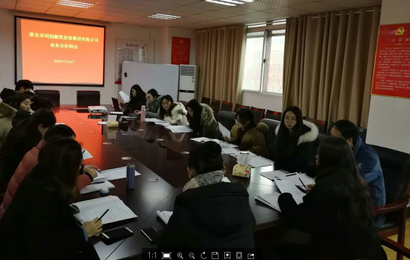 1月18日,市同創融資擔保集團業務部召開部門周例會,會議由業務一部部長李壯志、副部長徐欣主持。會議學習研究了《小微企業比例再擔保合作協議》和《2017年度全省融資擔保行業發展與監管工作暨業務培訓會議》相關內容。