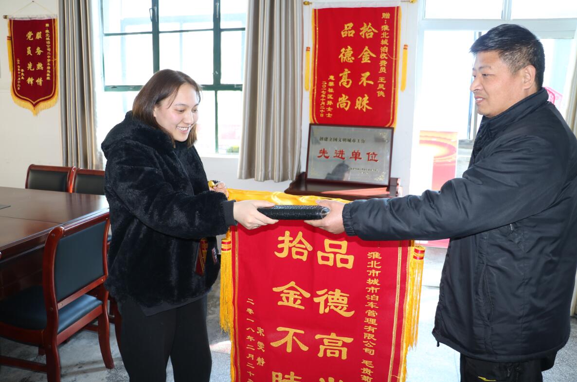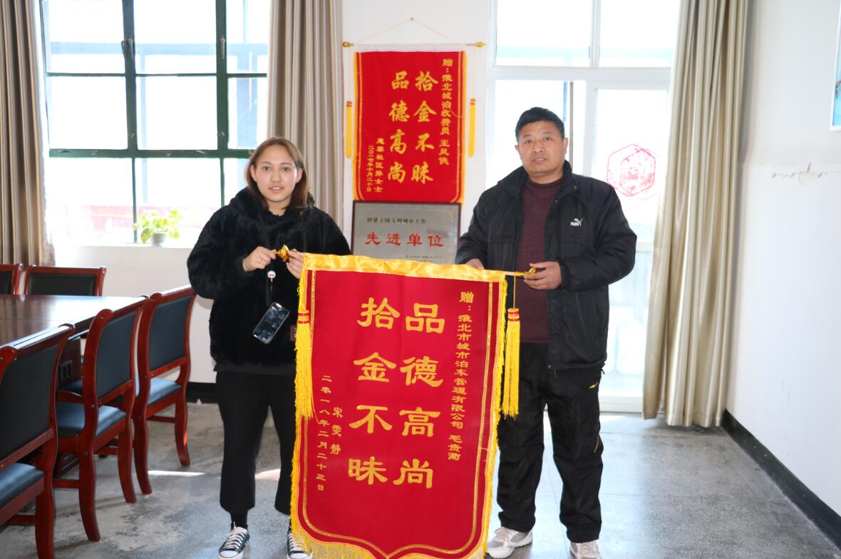 2月23日下午,市民宋女士將一面寫著“品德高尚,拾金不昧”的錦旗送到了城泊公司,她要感謝的是公司收費員毛貴菊。