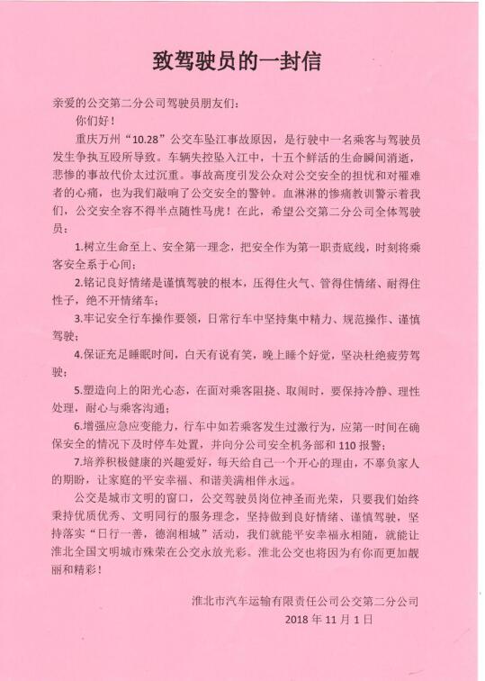 公交是城市文明的窗口,公交駕駛員崗位神圣而光榮,只要我們始終秉持優質優秀、文明同行的服務理念,堅持做到良好情緒、謹慎駕駛,堅持落實“日行一善,德潤相城”活動,我們就能平安幸福永相隨,就能讓淮北全國文明城市殊榮在公交永放光彩。淮北公交也將因為有你而更加靚麗和精彩!