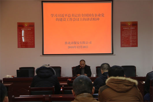 2018年12月18日,淮北市保安有限公司組織黨員干部在公司黨支部書記的帶領下,認真學習了中共中央總書記、國家主席、中央軍委主席習近平全國國有企業黨的建設工作會議的講話精神。