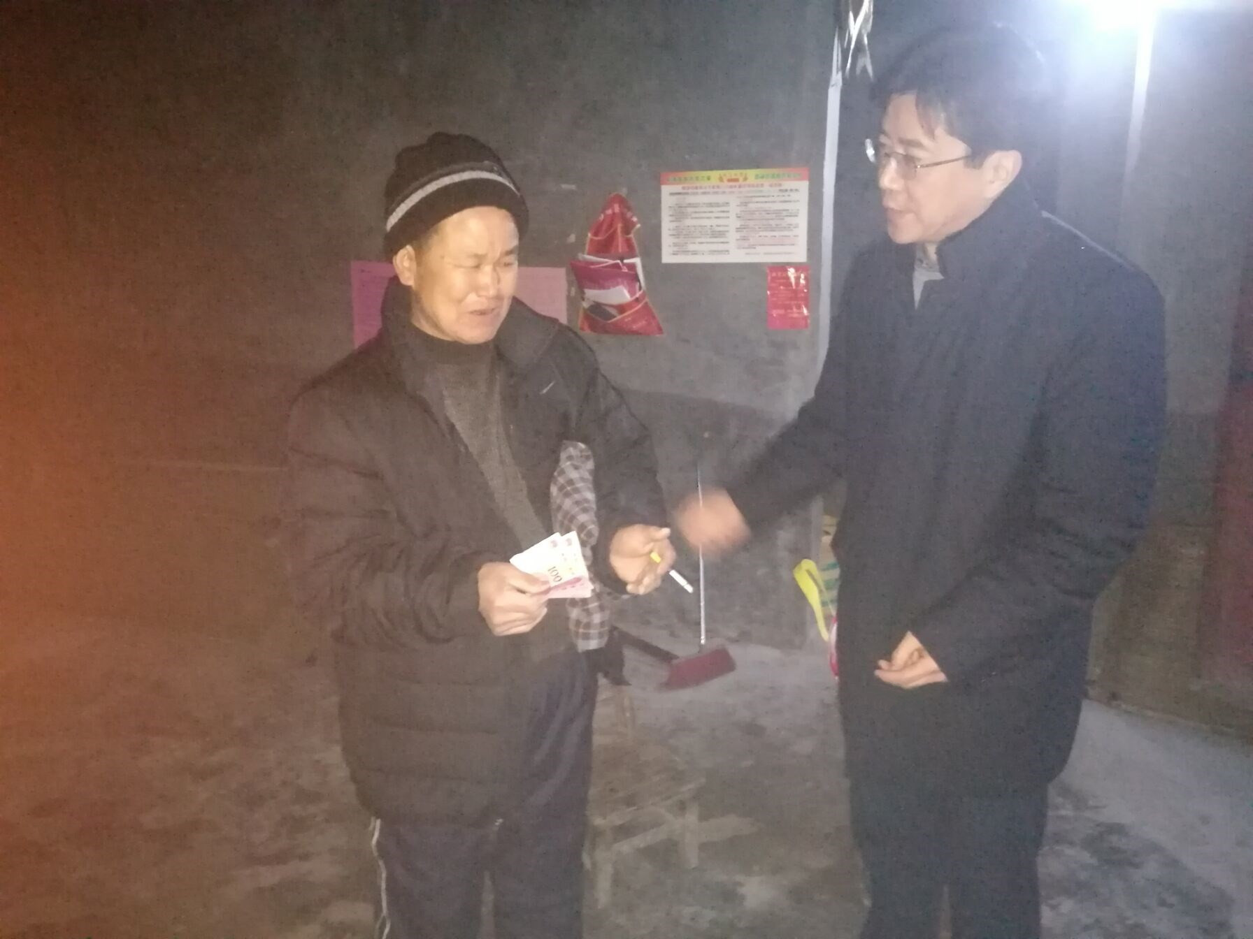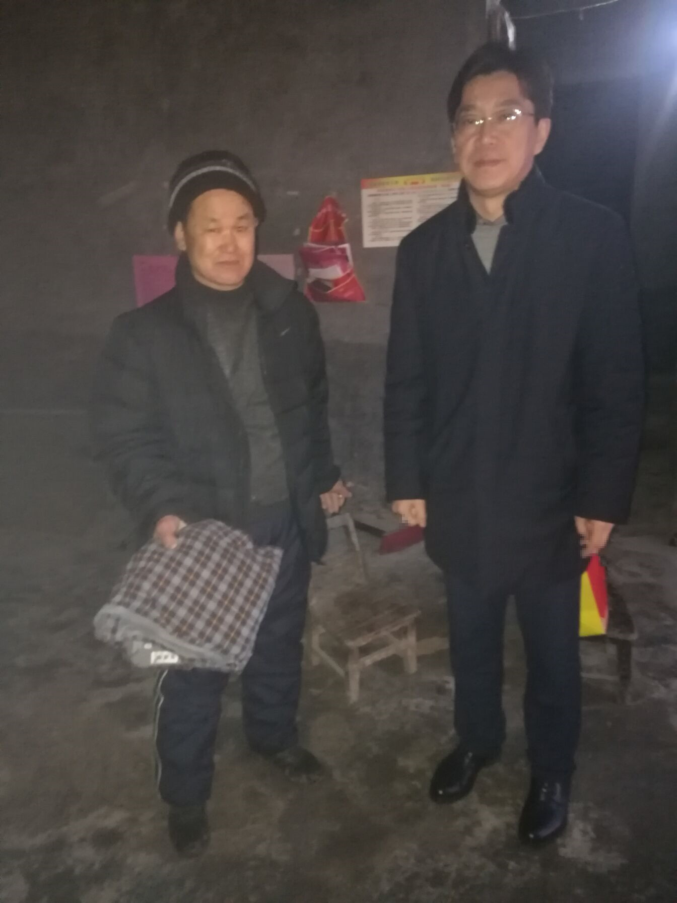 王獻忠同志與村民朱良超一戶促膝交談,關心村民家的生產生活狀況,鼓勵他們要照顧好自己的生活,堅定脫貧致富的決心,并親手送上慰問金、衣物、春聯,希望他們過一個祥和的春節。
