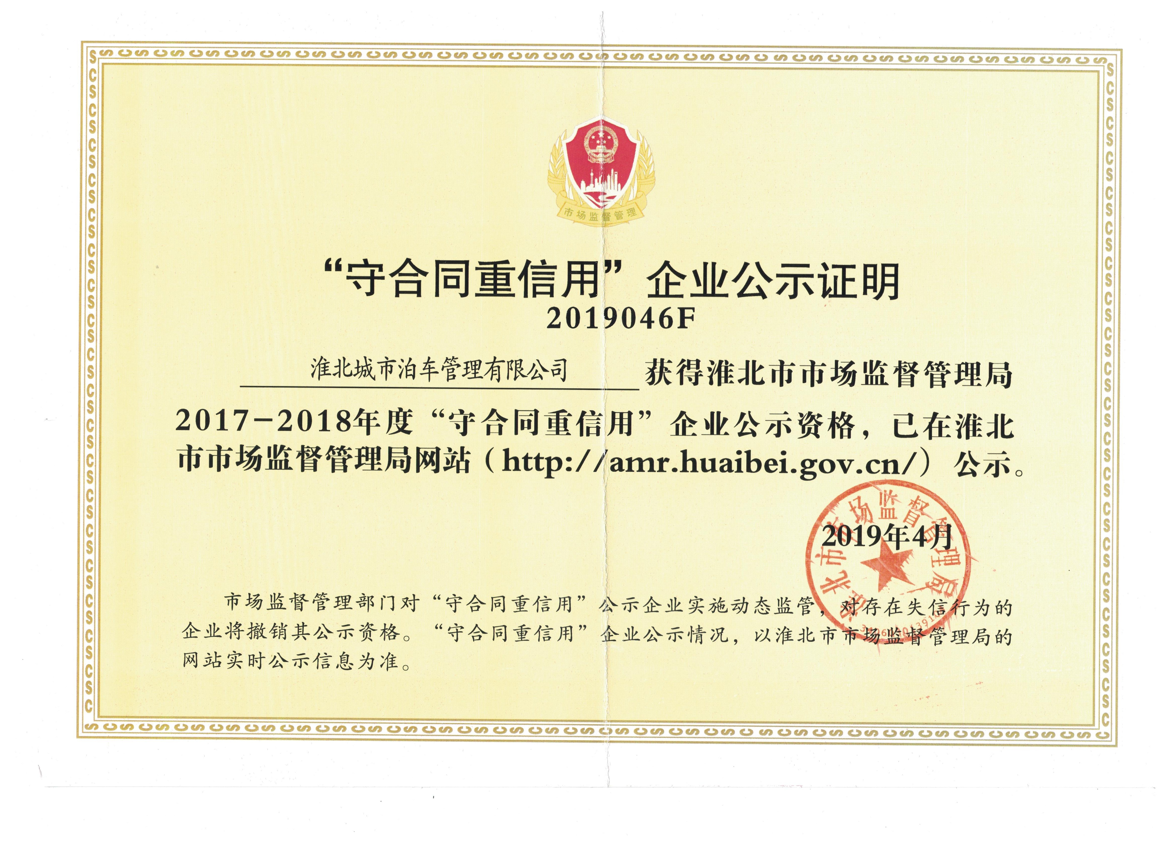 “人無信不立,事無信不成”,淮北城市泊車管理有限公司被評為2017-2018年度“守合同重信用”企業,該信息已在淮北市市場監督管理局官網公示。多年來,城泊公司堅持以誠信作為企業長遠發展的基石,以“誠信經營”作為公司發展宗旨,高度重視合同的規范管理,講誠信、重履約,真正做到對國家、社會、消費者負責,得到了社會各界的廣泛贊譽和認可。