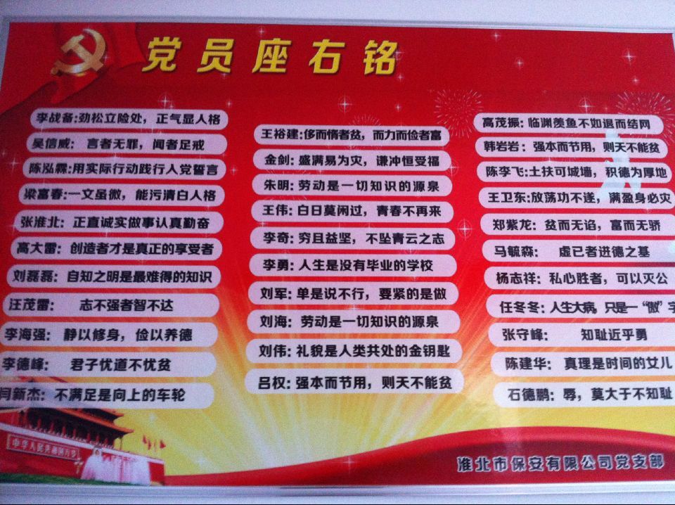 為了進(jìn)一步組織和動(dòng)員廣大黨員更好地為群眾辦實(shí)事、做好事、解難事,淮北市保安公司黨支部結(jié)合“兩學(xué)一做”活動(dòng),在全體黨員中開展“座右銘展示”活動(dòng),要求每個(gè)在職黨員以座右銘鞭策自己的行動(dòng),轉(zhuǎn)變工作作風(fēng),進(jìn)一步塑造黨員的良好形象。